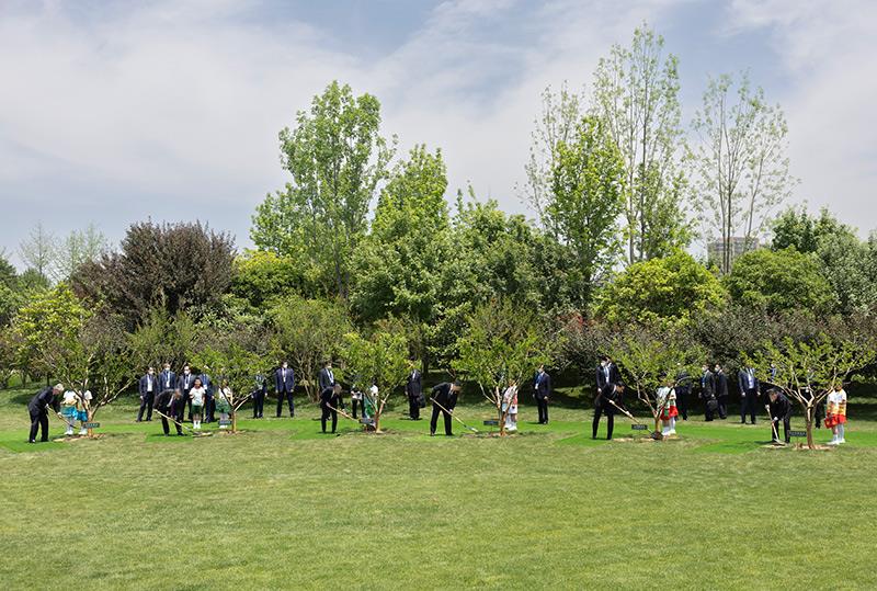 峰會結束后,習近平和中亞五國元首共同種下六棵石榴樹,既見證中國同中亞千年友好交往,也象征中國同中亞緊密團結合作,更寄托對中國-中亞關系美好未來的期待。新華社記者 殷博古 攝