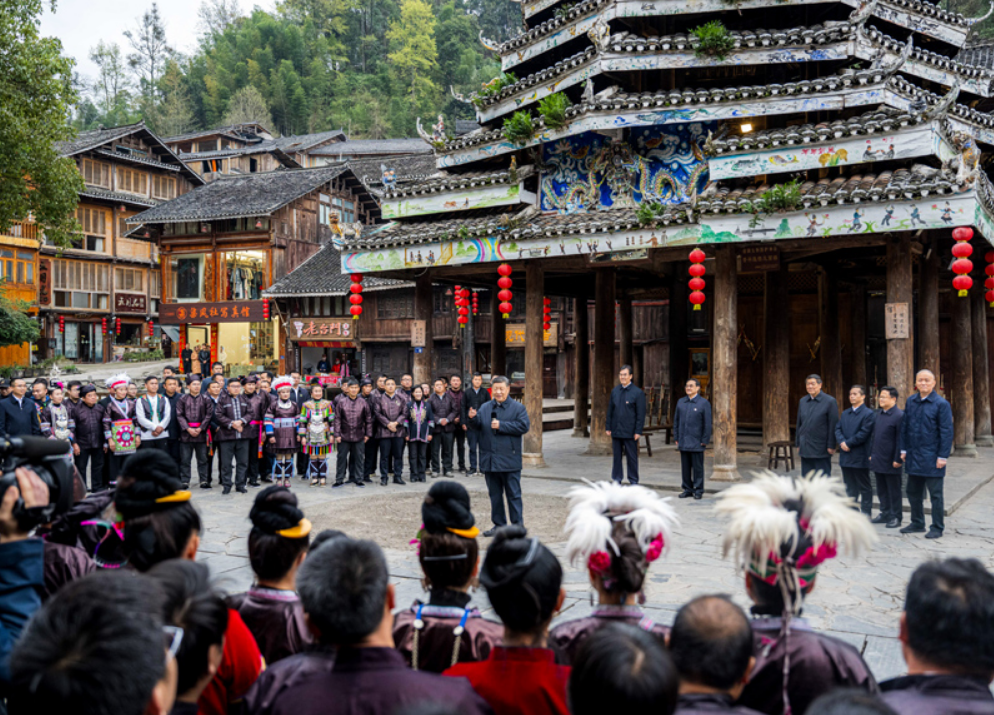 17日下午,習(xí)近平來到黔東南州黎平縣肇興侗寨考察。寨門口,身著民族盛裝的村民唱起侗族大歌歡迎總書記。習(xí)近平饒有興致地聽取侗族大歌的藝術(shù)起源、曲調(diào)特點(diǎn)、演唱形式等方面介紹。隨后,沿著村寨路道察看侗寨風(fēng)貌和旅游商鋪,不時(shí)駐足與店主、游客、村民互動(dòng)交談。在侗族文化展示中心,他詳細(xì)了解侗族歷史、風(fēng)俗和服飾、建筑等特色文化保護(hù)傳承情況。在侗鄉(xiāng)特色產(chǎn)業(yè)基地,他觀看蠟染工藝流程,對(duì)蠟染合作社堅(jiān)持顧客至上、質(zhì)量第一的運(yùn)營(yíng)理念給予肯定。習(xí)近平指出,少數(shù)民族文化是中華文化不可或缺的組成部分,既要保護(hù)有形的村落、民居、特色建筑風(fēng)貌,傳承無形的非物質(zhì)文化遺產(chǎn),又要推動(dòng)其創(chuàng)造性轉(zhuǎn)化、創(chuàng)新性發(fā)展,讓民族特色在利用中更加鮮亮,不斷煥發(fā)新的光彩。