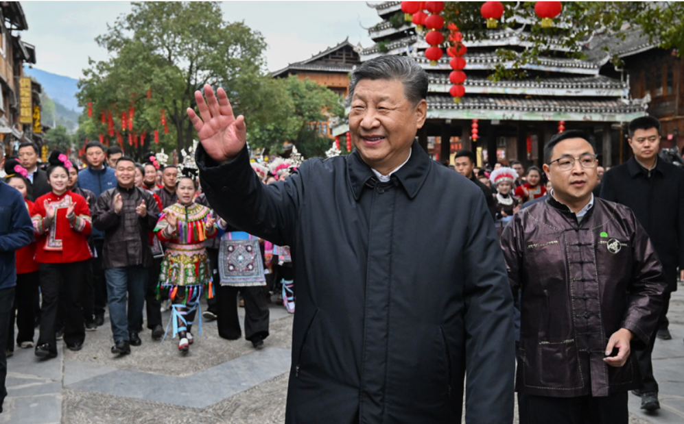 從鼓樓起身,村民們紛紛簇?fù)磉^來,熱烈鼓掌,高聲向總書記問好。習(xí)近平高興地回應(yīng)說,侗族人民樸實(shí)、勤勞、有文化、有智慧,希望大家在中國(guó)式現(xiàn)代化進(jìn)程中把鄉(xiāng)村振興搞得更好,祝愿大家的日子越過越紅火。離開侗寨時(shí),侗族群眾深情地唱起《侗歌聲聲唱給黨》,表達(dá)對(duì)總書記的熱愛和依依不舍。習(xí)近平頻頻揮手,同鄉(xiāng)親們道別。