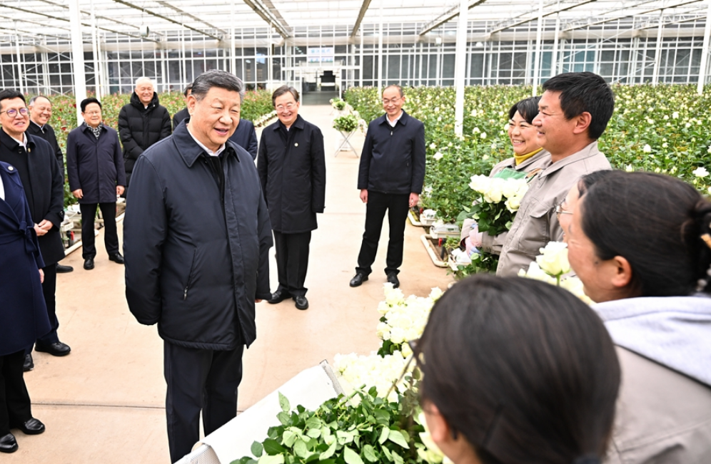 這是19日下午,習(xí)近平在麗江現(xiàn)代花卉產(chǎn)業(yè)園玫瑰花種植區(qū),同現(xiàn)場村民、技術(shù)人員親切交談。