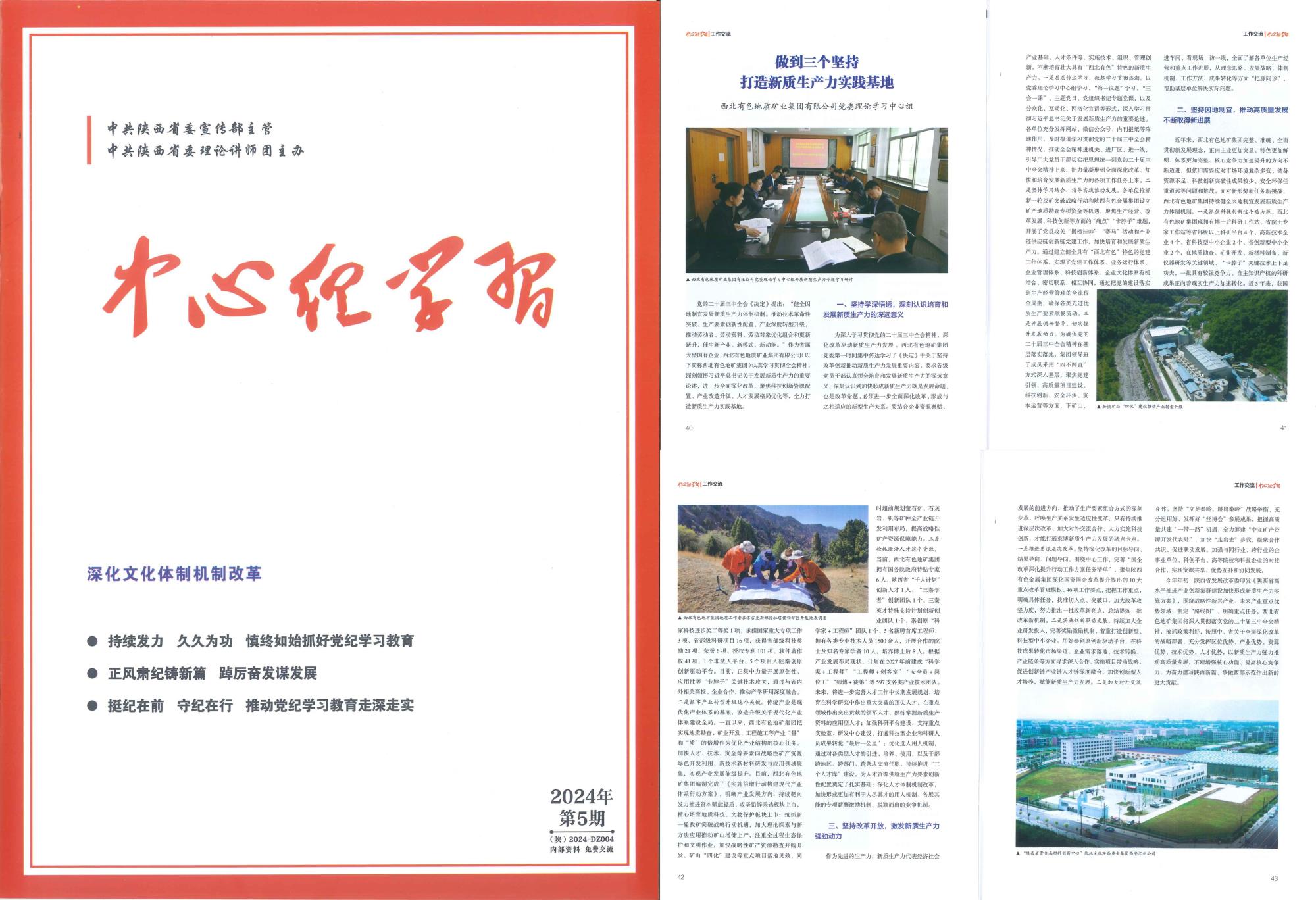 近日,由中共陜西省委宣傳部主管、中共陜西省委理論講師團(tuán)主辦的《中心組學(xué)習(xí)》雜志2024年第5期刊發(fā)地礦集團(tuán)黨委理論學(xué)習(xí)中心組署名文章《做到三個堅持 打造新質(zhì)生產(chǎn)力實踐基地》,宣傳推介兩集團(tuán)深入學(xué)習(xí)貫徹黨的二十屆三中全會精神,聚焦科技創(chuàng)新資源配置、產(chǎn)業(yè)改造升級、人才發(fā)展格局優(yōu)化等,全力打造新質(zhì)生產(chǎn)力實踐基地的做法和成效。