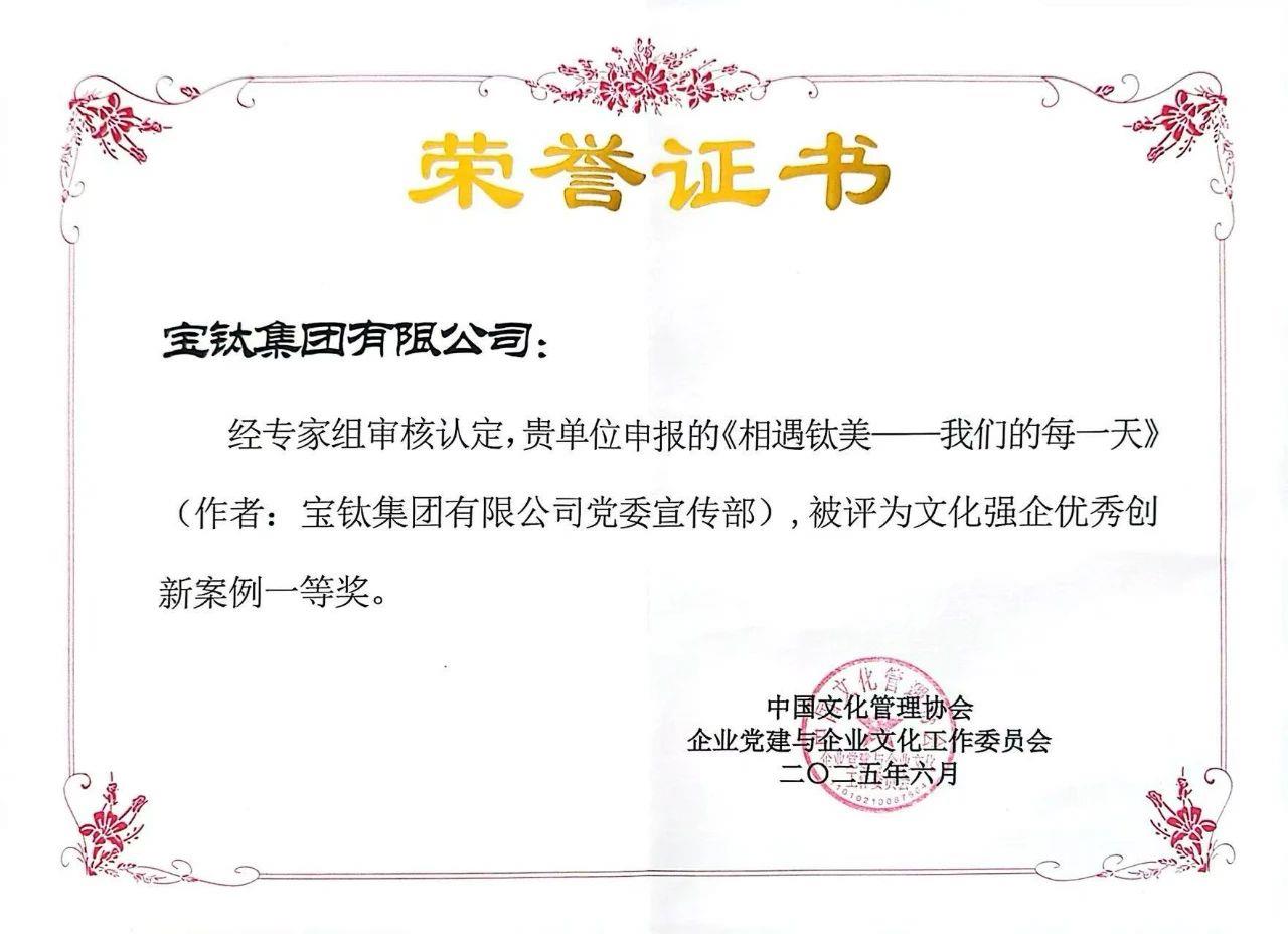近日,由寶鈦集團(tuán)黨委宣傳部、文化新聞中心創(chuàng)作的微紀(jì)錄片《相遇鈦美——我們的每一天》,被中國(guó)文化管理協(xié)會(huì)企業(yè)黨建與企業(yè)文化工作委員會(huì)評(píng)為文化強(qiáng)企優(yōu)秀創(chuàng)新案例一等獎(jiǎng)。這一榮譽(yù)的獲得,不僅是對(duì)該微紀(jì)錄片藝術(shù)價(jià)值和文化內(nèi)涵的高度認(rèn)可,更是寶鈦集團(tuán)企業(yè)文化建設(shè)工作成效的有力證明。