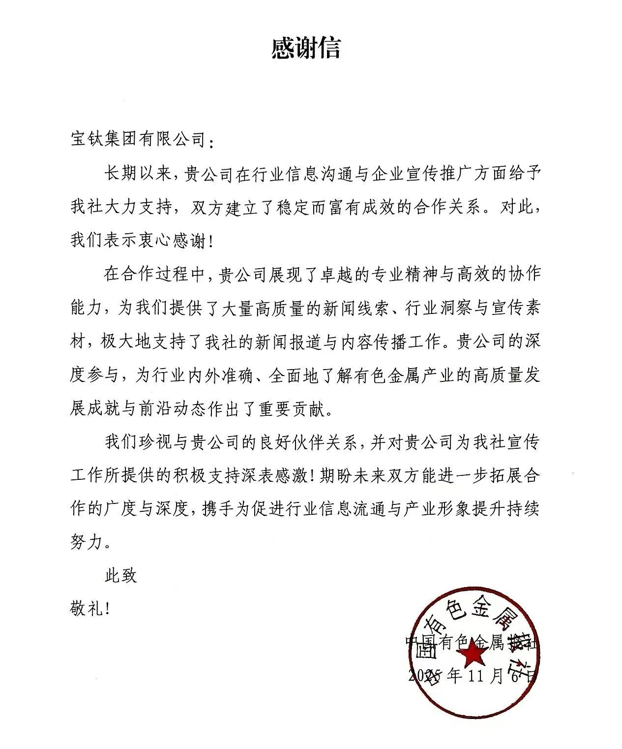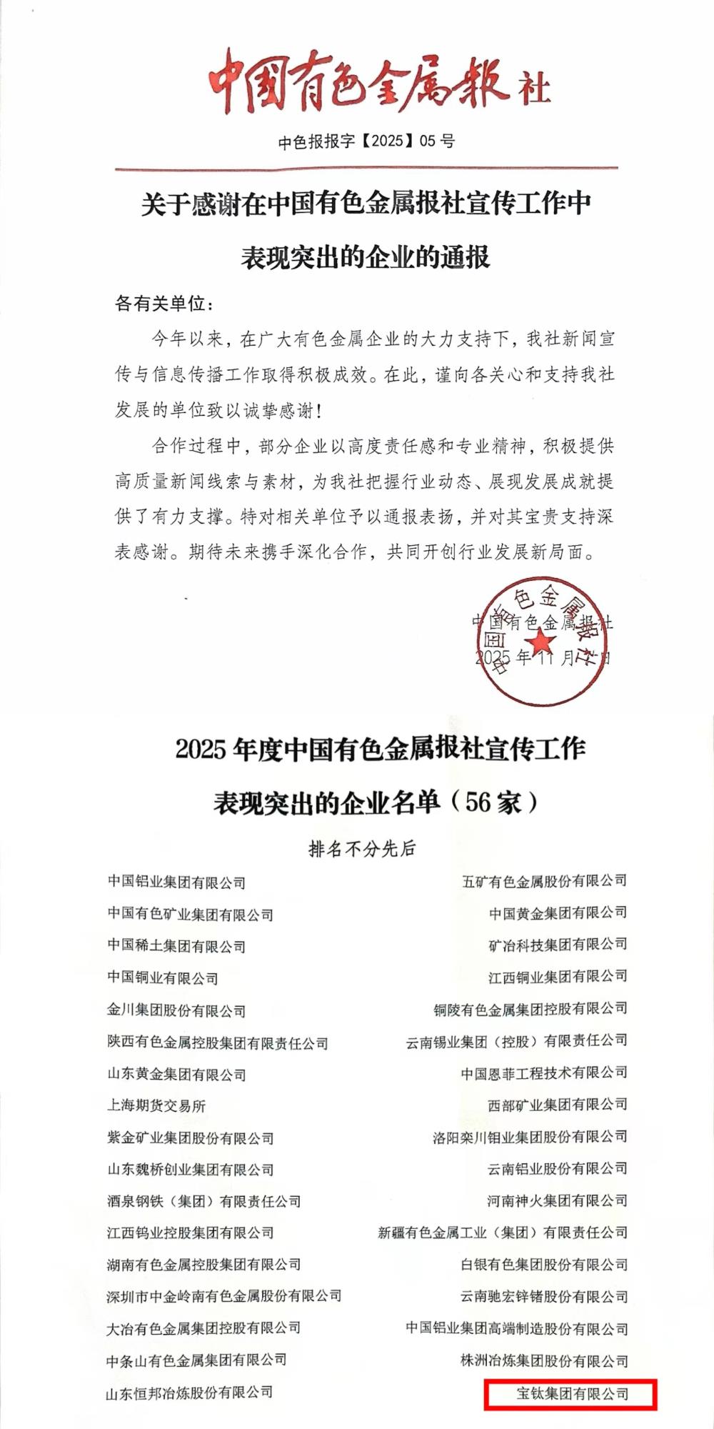 寶鈦集團宣傳工作獲中國有色金屬報社通報表揚