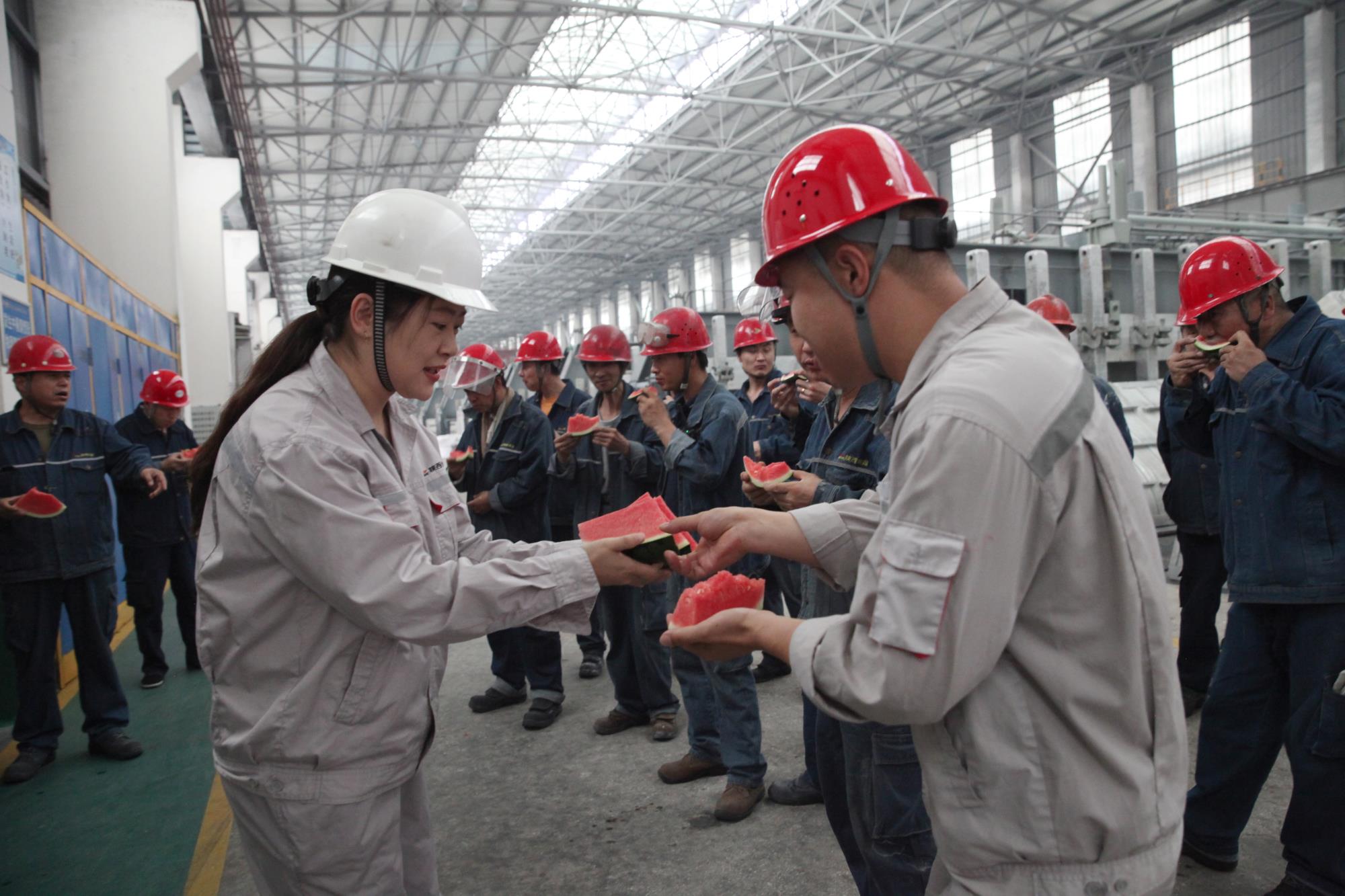 連日來驕陽(yáng)似火,高溫天氣持續(xù)籠罩,陜西美鑫鋁鎂合金分公司生產(chǎn)一線一派繁忙景象,“奮戰(zhàn)二季度 實(shí)現(xiàn)雙過半”活動(dòng)正如火如荼的進(jìn)行著。陜西美鑫公司女工委積極響應(yīng)公司黨政號(hào)召,6月14日下午,在鋁鎂合金分公司電解一、二車間開展“戰(zhàn)酷暑、保安全 與一線職工肩并肩”夏季送清涼活動(dòng),為奮戰(zhàn)在高溫一線的職工送去一絲清涼和一份關(guān)懷。