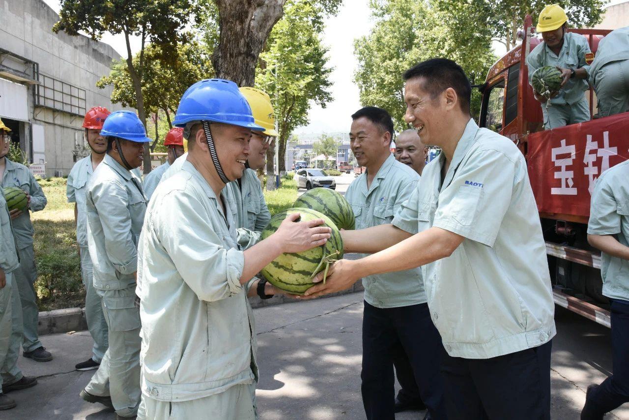 炎炎夏日,驕陽似火。6月12日上午,寶鈦集團(tuán)領(lǐng)導(dǎo)王儉、賀治民、耿愛武率相關(guān)部門負(fù)責(zé)人,深入寶鈦集團(tuán)裝備制造公司、板帶材料分公司、鍛造廠和寬厚板公司等生產(chǎn)單位,親手將消暑解渴的西瓜送到職工手中,向奮戰(zhàn)在高溫一線的職工致以親切慰問,并叮囑大家做好防暑降溫工作。"