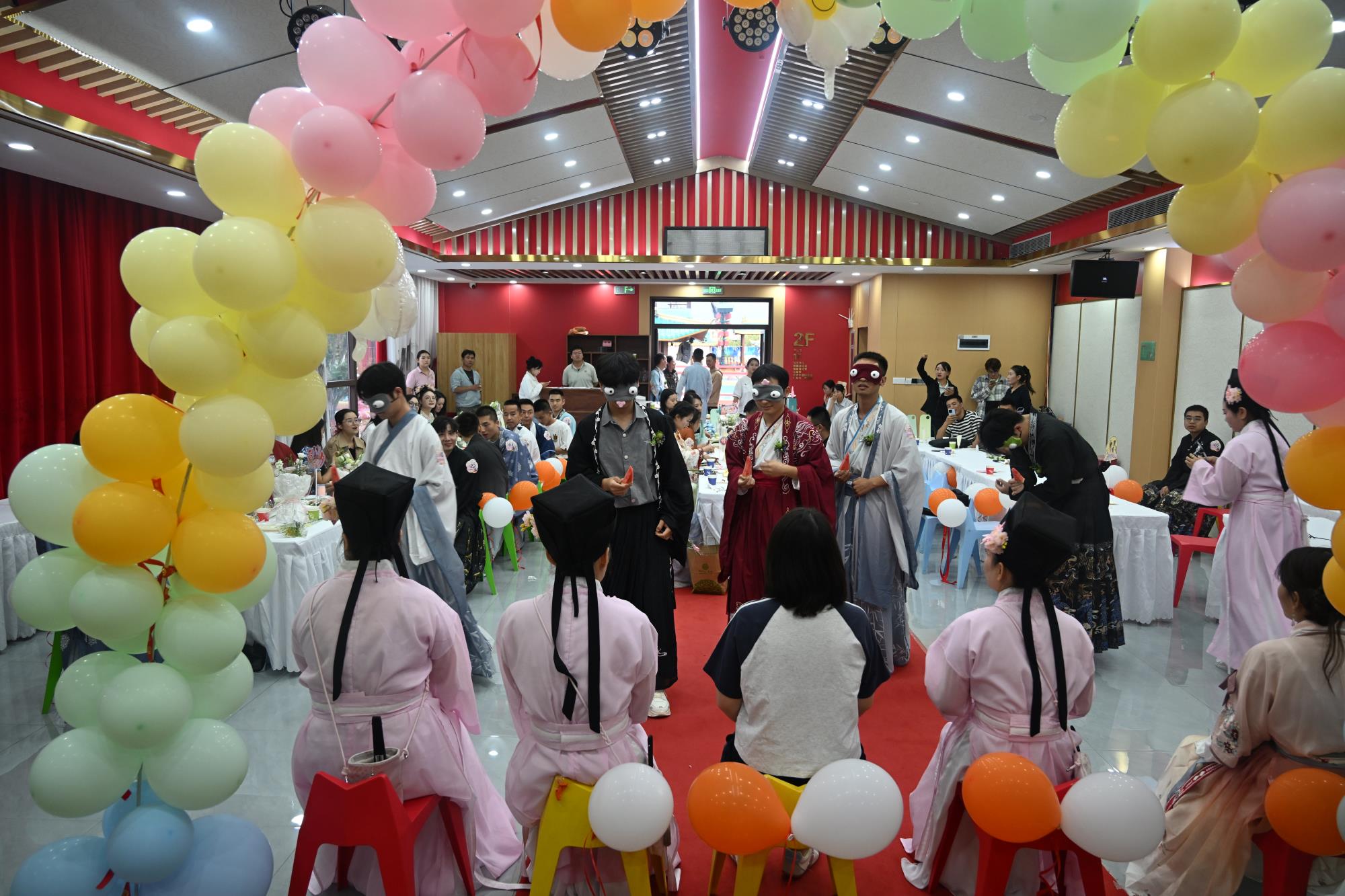活動伊始,身著典雅漢服的青年男女在花月薈主入口簽到,領(lǐng)取專屬胸針與手環(huán),于古韻氛圍中沉浸式感受傳統(tǒng)文化魅力。在隨后的游園定向挑戰(zhàn)環(huán)節(jié),男女嘉賓在繽紛花海中合影留念,協(xié)力完成“終極考官”設(shè)定的趣味任務(wù);高潮迭起的“喜從天降拋繡球”點(diǎn)燃全場熱情,成功搶得繡球的嘉賓組成“繡球CP”;在小劇場二樓,“愛情實驗室”趣味游戲輪番上演,“桃花朵朵開”“蒙眼遞西瓜”……現(xiàn)場氣氛溫馨融洽。在主持人的鼓勵下,多位嘉賓勇敢表達(dá)心意,最終公司5名單身青年成功牽手,收獲全場熱烈掌聲與美好祝福。
