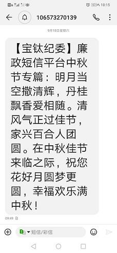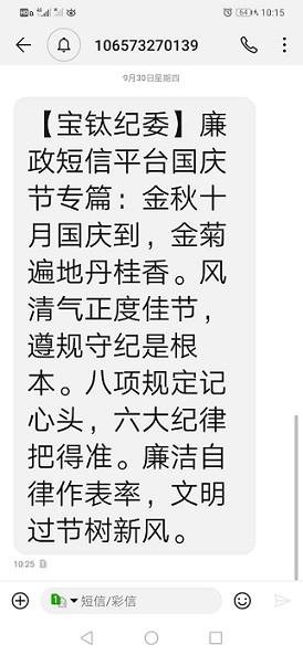 寶鈦集團(tuán)紀(jì)委利用寶鈦啟明星微信公眾號(hào)、寶鈦OA協(xié)同網(wǎng)等新媒體平臺(tái),轉(zhuǎn)載中央紀(jì)委國(guó)家監(jiān)委在中秋、國(guó)慶節(jié)前通報(bào)曝光的違反中央八項(xiàng)規(guī)定精神典型案例,在利用反面典型開(kāi)展警示教育的同時(shí),一改往日說(shuō)教式短信的文風(fēng),結(jié)合中秋、國(guó)慶的節(jié)日特點(diǎn),自編原創(chuàng)以廉潔過(guò)節(jié)為主題的打油詩(shī)。918日,以明月當(dāng)空灑清輝,丹桂飄香愛(ài)相隨。清風(fēng)氣正過(guò)佳節(jié),家興百合人團(tuán)圓。在中秋佳節(jié)來(lái)臨之際,祝您花好月圓夢(mèng)更圓,幸福歡樂(lè)滿中秋為內(nèi)容;930日,以金秋十月國(guó)慶到,金菊遍地丹桂香。風(fēng)清氣正度佳節(jié),遵規(guī)守紀(jì)是根本。八項(xiàng)規(guī)定記心頭,六大紀(jì)律把得準(zhǔn)。廉潔自律作表率,文明過(guò)節(jié)樹(shù)新風(fēng)為內(nèi)容,通過(guò)寶鈦廉政短信平臺(tái)向公司全體中層及以上干部發(fā)送節(jié)前提醒短信2條、共450人次。