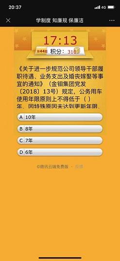 活動(dòng)中,該廠副科級(jí)以上干部和重點(diǎn)崗位人員近百人通過(guò)關(guān)注微信公眾號(hào)“您有問(wèn)題我來(lái)答”完成了答題。題目?jī)?nèi)容圍繞《關(guān)于進(jìn)一步規(guī)范公司領(lǐng)導(dǎo)干部履職待遇、業(yè)務(wù)支出及婚喪嫁娶等事宜的通知》《金堆城鉬業(yè)集團(tuán)有限公司紀(jì)律處分決定執(zhí)行工作規(guī)定(暫行)》《中共金堆城鉬業(yè)股份有限公司委員會(huì)貫徹落實(shí)中央八項(xiàng)規(guī)定實(shí)施細(xì)則精神的具體辦法》等13項(xiàng)黨風(fēng)廉政建設(shè)制度,通過(guò)選擇、判斷兩種題型,深度檢測(cè)黨員干部了解、掌握制度的基本情況,該廠紀(jì)委在答題結(jié)束后還針對(duì)易錯(cuò)題進(jìn)行了跟蹤輔導(dǎo)。