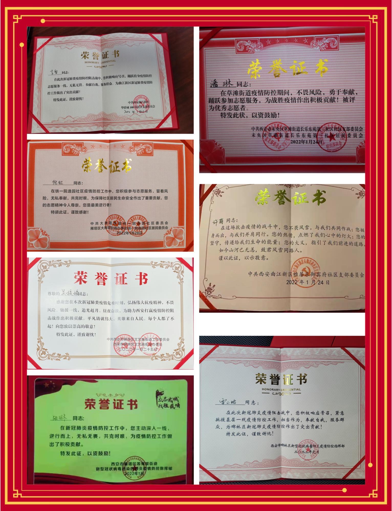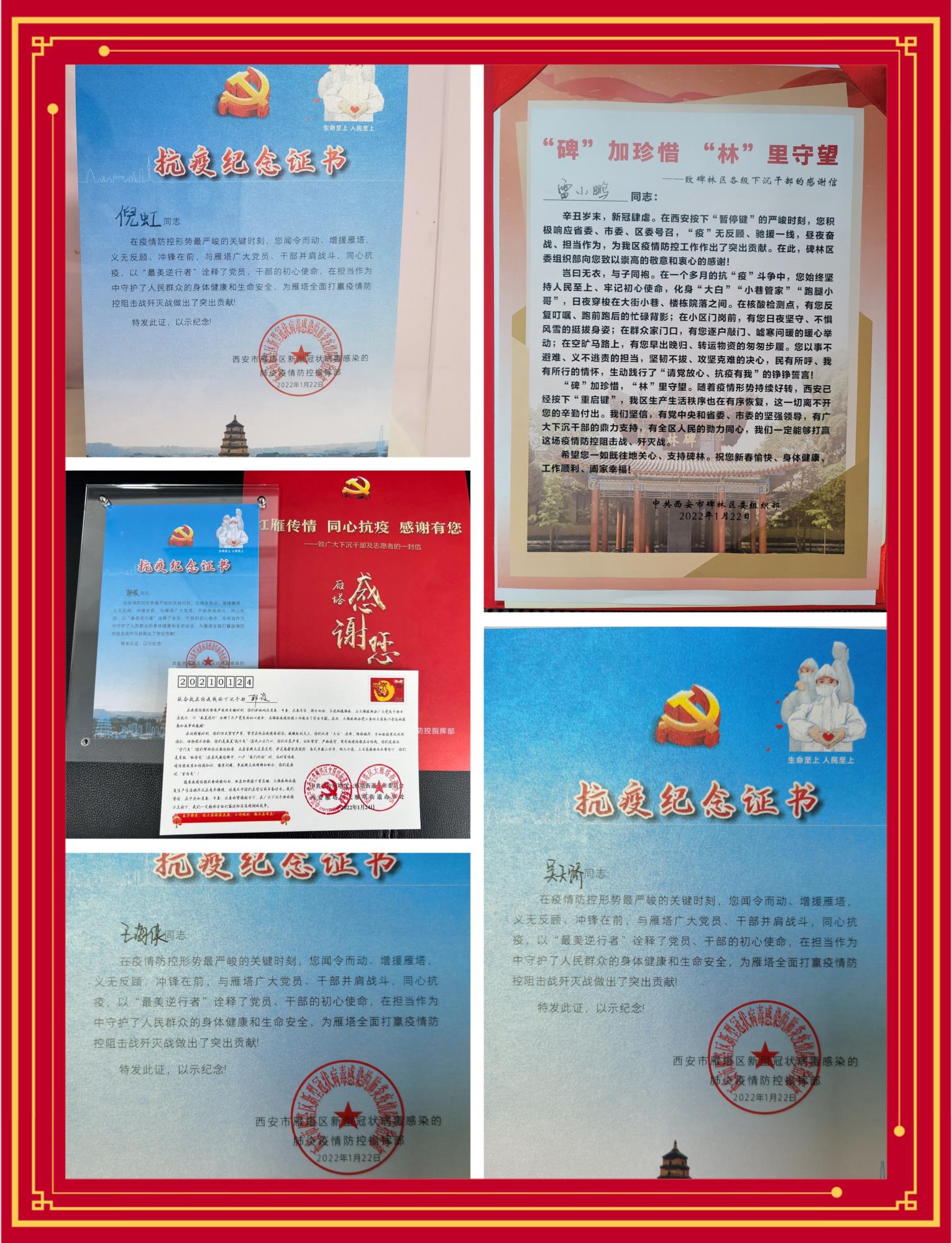 “經(jīng)九南路社區(qū)疫情防控黨員先鋒崗”稱號(hào)。此外,支部紀(jì)檢委員劉新偉和公司紀(jì)委委員袁媛在接到命令的的第一時(shí)間就向所在社區(qū)進(jìn)行報(bào)到,與社區(qū)人員積極配合,協(xié)助開(kāi)展工作,圓滿完成了疫情防控工作。