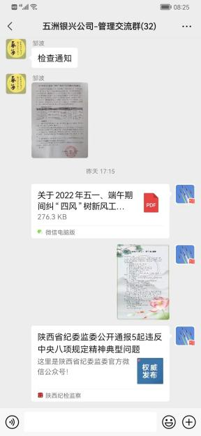 節(jié)中有檢查。4月30日,公司紀委副書記劉行前往柞水縣金米溝,對銀礦本部進行了突擊檢查,主要對留守值班、疫情防控、安全生產、車輛封存等情況作了檢查,對發(fā)現的問題即時反饋,要求立行立改、即知即改,及時完善各項工作措施,積極應對突發(fā)事件,確保公司糾治“四風”工作持續(xù)向好;公司紀委緊盯節(jié)日期間易發(fā)多發(fā)問題,圍繞違規(guī)收送禮品禮金、違規(guī)吃喝、違規(guī)使用公務用車等重點問題,針對費用報銷情況展開專項檢查并與財務部負責人進行交流,要求對存在的問題和漏洞及時進行修改和完善;全體紀檢員主動作為,對照基層單位實際生產情況,分別組織開展了節(jié)日期間糾治“四風”監(jiān)督檢查。